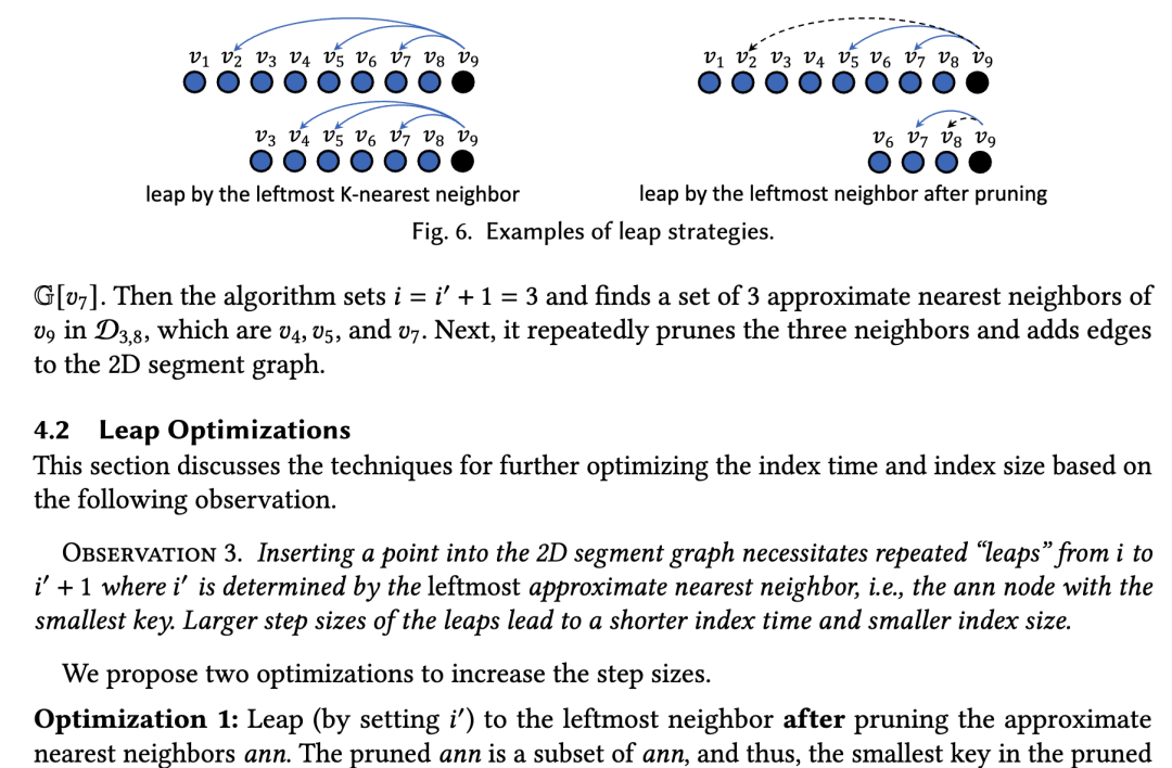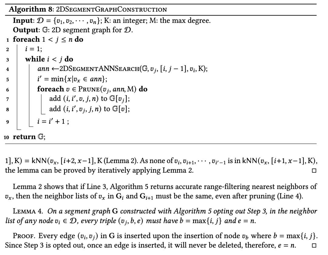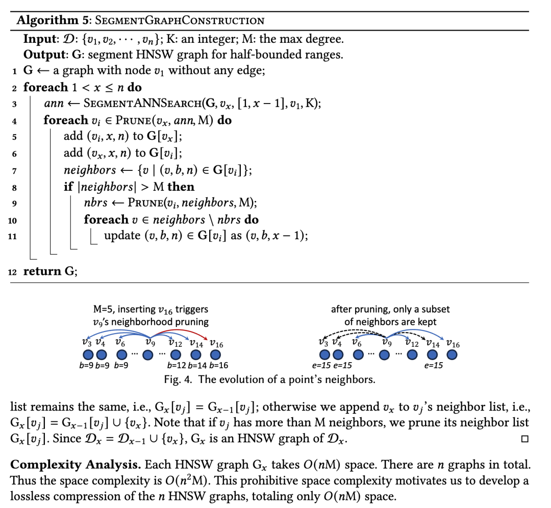我们首先考虑半范围查询,即符合标量范围的数据下标为[1,z]的查询(在SQL中表现为property<z'而非x'<property<y')。我们从下标1开始,建n个图(n为数据集大小),第i个图仅包含[1,i]下标的数据子集,命名为,,...,,这样对于查询[1,z],我们直接使用进行查询即可。接下来考虑如何压缩这n个结构高度相似的图。注意到在不断插入新点的过程中,老点的邻居也会更新,可能会插入一条指向新点的边,也可能在裁边时裁掉某些边,因此我们可以在这个过程中记录每条边的“寿命”,即插入时间和删除时间。在查询时(包括构建时的查询)我们只关注时间满足要求的边而忽视其它的。注意这里的时间实际上指的是标量的值。这样一个结构被称为分段图。