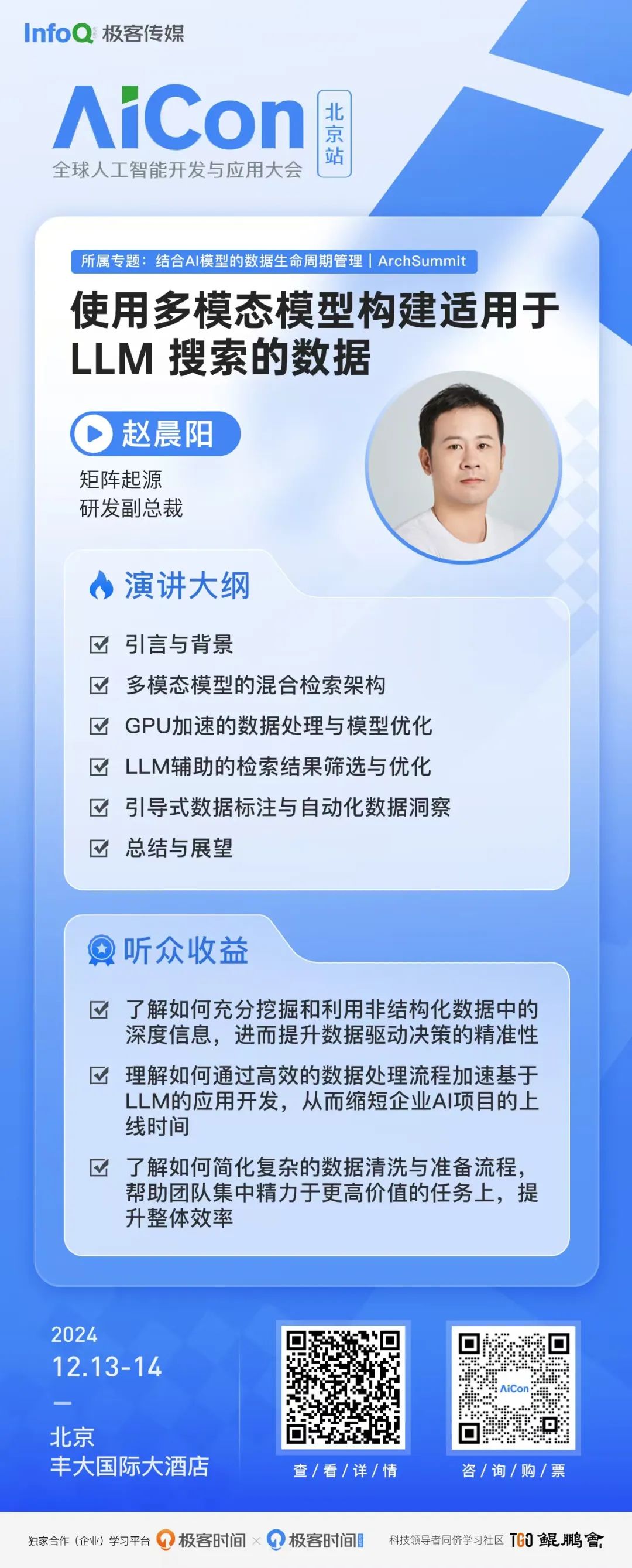 AICon 全球人工智能开发与应用大会是由极客邦科技旗下 InfoQ 中国主办的人工智能和大模型技术盛会,主要面向各行业对人工智能和大模型感兴趣的资深工程师、产品经理、数据分析师,会议聚焦大模型训练与推理、AI agent、RAG、多模态大模型等热门方向,会议不仅安排了精彩的演讲,还策划了包括闭门会议、圆桌交流、互动展区等多种社交活动,一方面为参会人员提供宝贵的交流学习、拓展人脉的机会,另一方面也为相关企业和机构提供一个展示自身实力和成果的舞台。