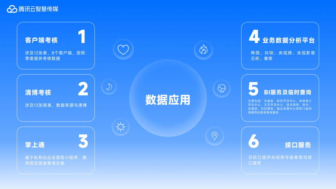 腾讯利用大数据技术,助力总台建设面向全台节目部门的评估考核系统。通过数据实现对总台所有节目部门进行客观考核,为决策提供有力支持。