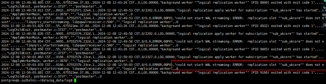CREATE SUBSCRIPTION sub_ukcore CONNECTION 'host=10.30.***.*** port=5432 dbname=ukprod user=repuser password=*****************'