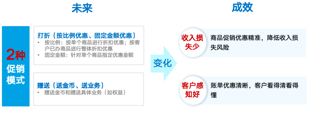 营销规则简化:通过对营销中心规则进行统一梳理、分析、简化,促销模式精简为打折、赠送两大类,以便于客户办理活动,让客户看的懂、办的快,同时降低账务处理复杂度,减少收入漏跑。