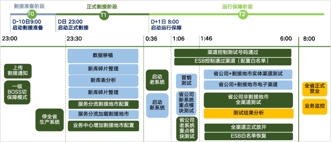 此次新一代数智云原生奇擎基线营销中心的部署,采取了分阶段割接的策略,包括割接预演、大区割接及全省割接三个环节。割接采用全新的全量+实时增量自动同步、透传+在线转换的数据迁移方案,极大缩减割接操作时间,割接当晚数据移植仅两个小时,即启动全面的业务测试,给割接测试、风险应对预留了充分时间。