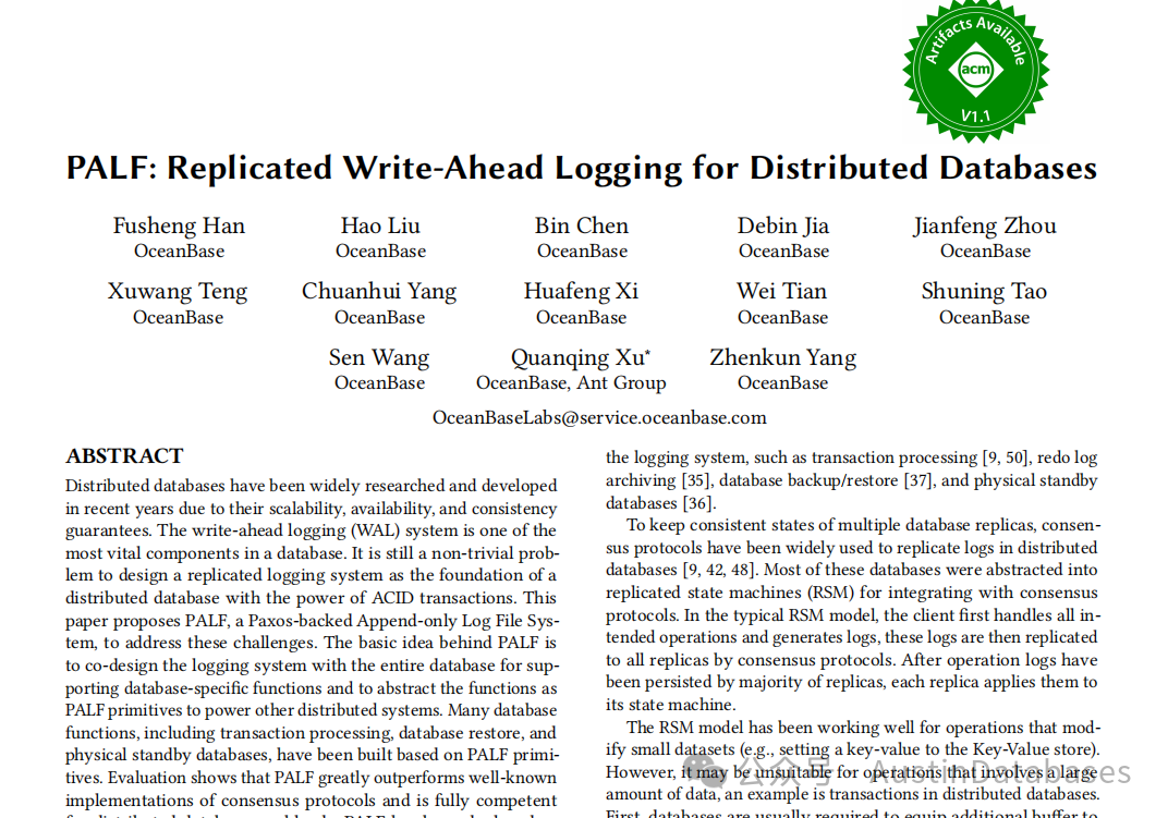 本文提出了一种名为PALF的Paxos支持的追加日志文件系统,以应对这些挑战。PALF背后的基本思想是设计一个数据库共用的日志记录系统,以支持数据库特定功能,并将这些功能抽象为PALF基本操作,以支持分布式系统。基于PALF基本操作的数据库功能,包括事务处理、数据库恢复和物理备份数据库。经过测试和评估,完全能胜任分布式数据库负载。PALF已作为OceanBase 4.0数据库的一个组件部署,并与其一起开源。