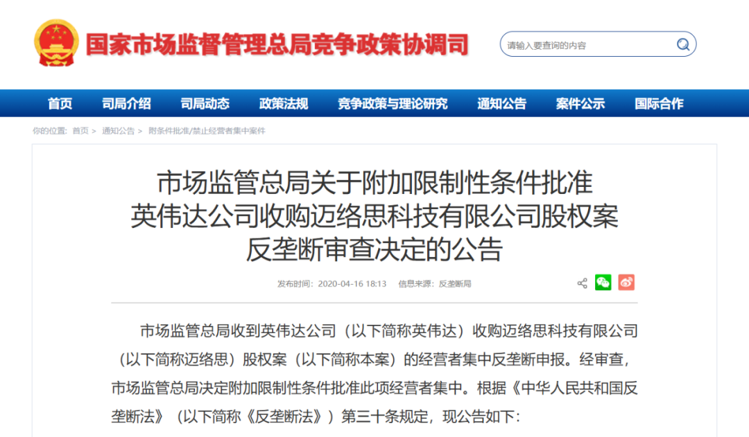 2019年4月24日,国家市场监督管理总局收到上述收购的经营者集中反垄断申报。2020年4月,国家市场监督管理总局依法附加限制性条件批准英伟达收购迈络思。