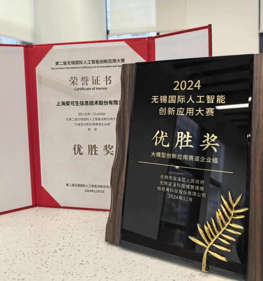 在这样的大背景下,上海爱可生信息技术股份有限公司积极投身于人工智能技术的探索与实践,自研的智能数据库运维助手 ChatDBA于 “2024 无锡国际人工智能创新应用大赛” 中,在大模型创新应用赛道企业组荣获优胜奖。