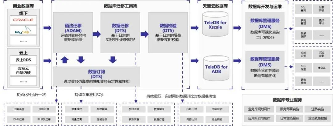 天翼云通过数据传输服务(DTS)与TeleDB数据库的结合,为企业打造了全链路的一站式数据迁移解决方案,能完美应对上述挑战。天翼云数据传输服务软件(DTS)V3.0是天翼云数据库自主研发的新一代数据库在线迁移和数据同步产品,集成Adam语法转换工具,具备迁移评估、结构迁移、全量同步、增量同步、数据稽查、数据订阅六大功能为一体,与天翼云数据库TeleDB高度兼容,形成完整的数据迁移解决方案,帮助用户实现不停服数据迁移、数据异地灾备/双活、跨境数据同步、缓存更新等多种应用场景,成为企业数字化转型中的加速器。