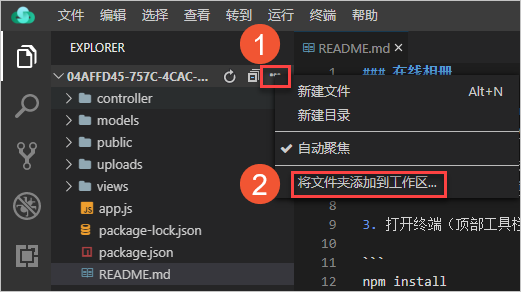 i. 在左侧的文件导航栏,选择... > 将文件夹添加到工作区。