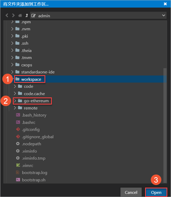 ii. 在弹出的对话框,单击workspace,选择go-ethereum文件夹,并单击Open。