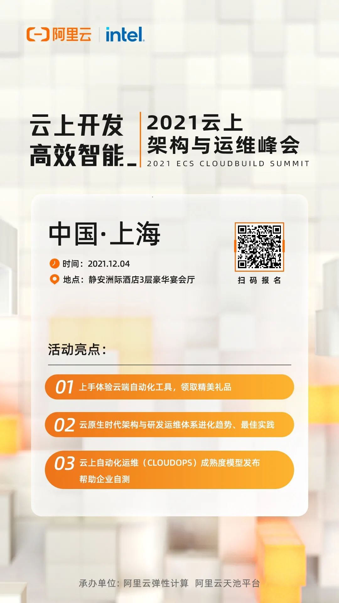 福利时间:2021云上架构与运维峰会12月4日在上海举办,同时在线直播,阿里云与优秀企业技术大咖分享;云上自动化运维成熟度模型发布;体验动手实验可领取精美礼品。欢迎点击阅读原文或扫描下方二维码,报名参会或预约直播。
