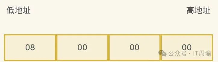 小端存储的好处是适合做类型转换,比如数字8采用小端存储,那么int类型和short类型对应的字节序为:
