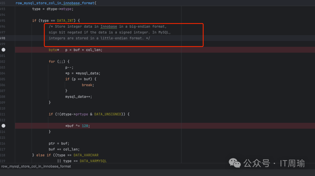 大端小端其实各有优势,在MySQL中,MySQL用的是小端存储,InnoDB用的是大端存储,所以MySQL需要把数字从小端格式转成大端格式,注意下图中的for循环