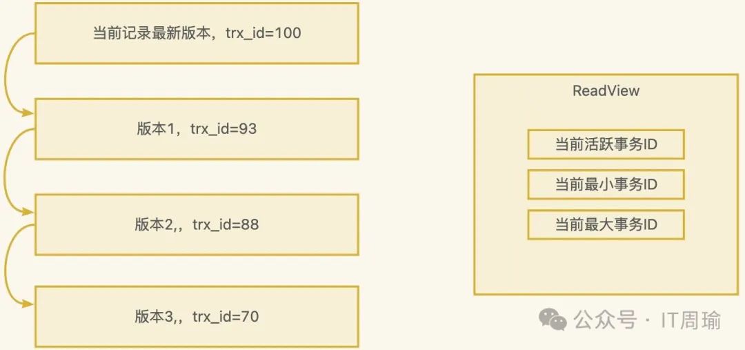 当一个事务修改一条记录时,会将记录的历史版本也记录下来,从而一条记录会对应一条版本链,而且每次修改时都会将当前的事务ID保存下来,所以一条记录的多个版本可能对应了不同的事务ID,而且在InnoDB中,事务ID是自增的,是有顺序的。
