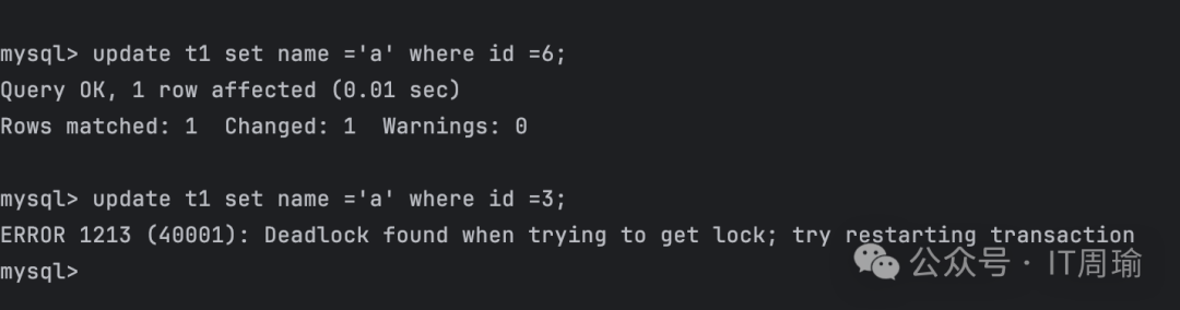 由于是根据id进行的更新,id是主键,是唯一的,这种情况就只需要对id=3这条记录加行锁就可以了,并不需要加next-key锁,也就是并不需要锁id=3前面的间隙,因为id=3前面的间隙对应的记录一定不是id=3,所以不用锁间隙。