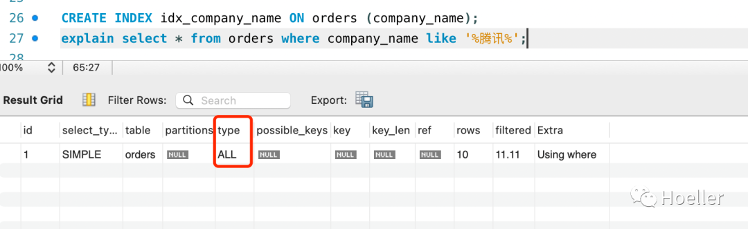 创建一个索引,执行where company_name like '%腾讯%'
