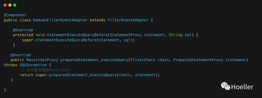 Druid提供了FilterEventAdapter机制,可以用来拦截数据库连接的创建、Statement或PreparedStatement的创建、SQL语句的执行等等,我们可以自定义一个FilterEventAdapter: