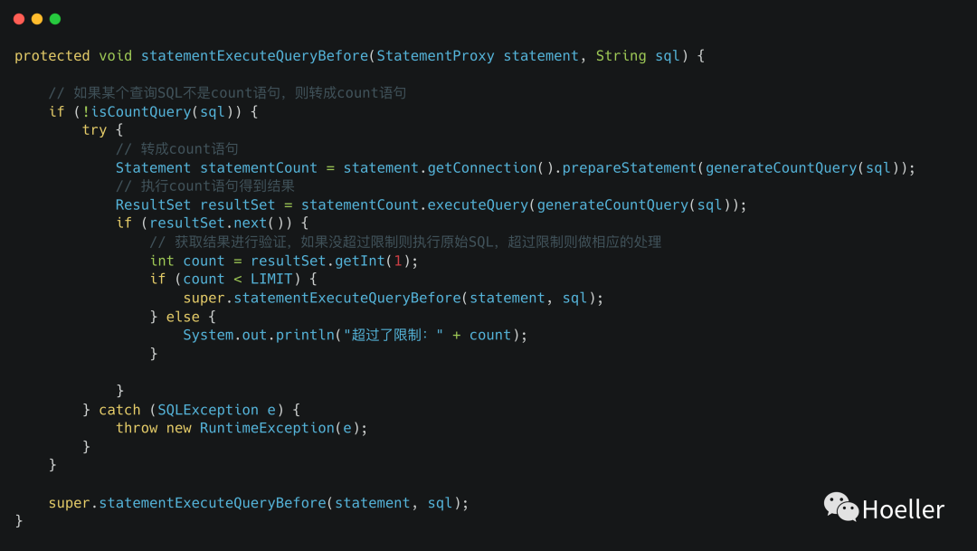 这种方式的好处是:如果某个查询SQL确实超过限制了,那么就它被拦截了,但是缺点是:如果很多SQL并没有超过限制,那么就多余执行了count语句,降低了性能。