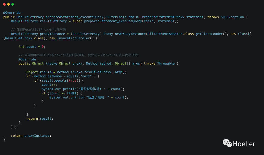 方法,思路是:先执行原始SQL,得到ResultSet,然后通过ResultSet来判断结果集是否超过了限制,如果超过了限制则告警,比如代码为: