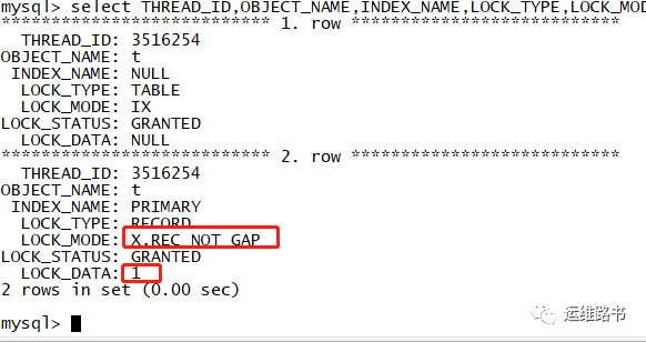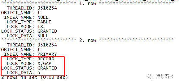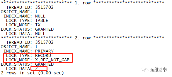 查看锁的情况:id=2的数据行被锁住了,使用的X型记录锁