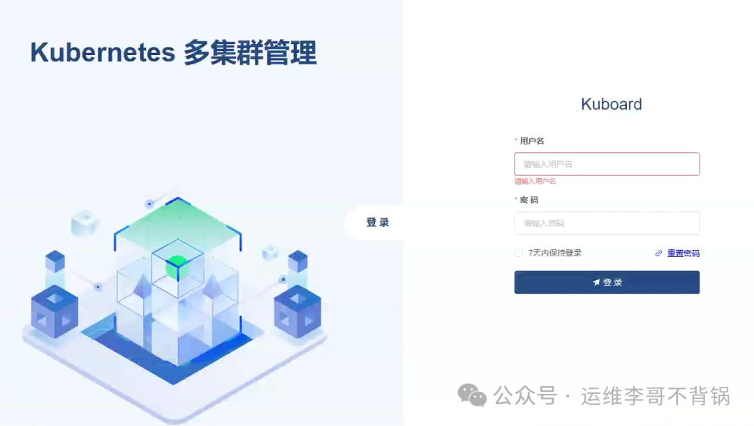 在浏览器输入 http://10.0.0.100:80 即可访问 Kuboard v3.x 的界面,登录方式: