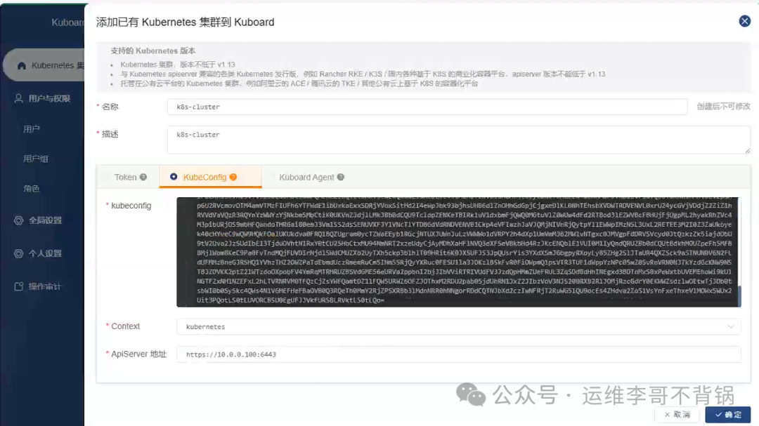 在kubernetes集群master节点执行 cat ~/.kube/config,然后将输出复制到文本框即可