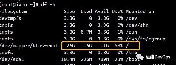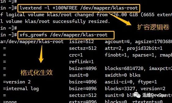 lvextend -l +100%FREE dev/mapper/klas-root #扩容LVM逻辑卷xfs_growfs /dev/mapper/klas-root #刷新磁盘文件系统