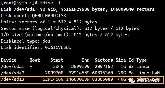 6、分区后可以看到已经出现的一个新的分区/dev/sda3,如图:
