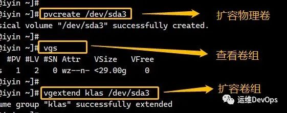 7、接下来对虚拟机的PV进行扩容,vg也会一起扩容过去,执行命令如下: