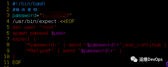 例1:下面的脚本实现的功能是自动修改root密码,本脚本以bash脚本为基础,添加expect解释器,如图:
