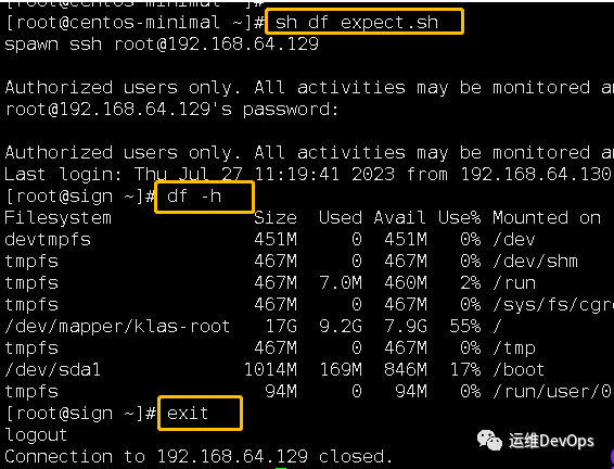 例2:下面的脚本登录远程机器,并查看远程机器的磁盘空间,如图: