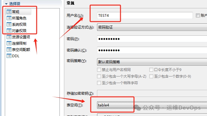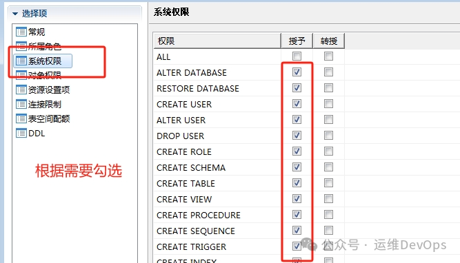 用户权限可以根据需要选择,至少保证创建表的权限要有,如图: