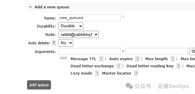1、登录管理页面,创建队列(Queues),持久化方案选择持久(Durable),如图:
