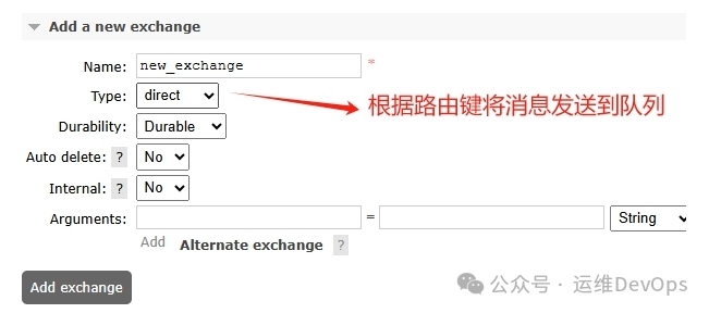 2、创建交换器(Exchanges),类型选择路由键,如图: