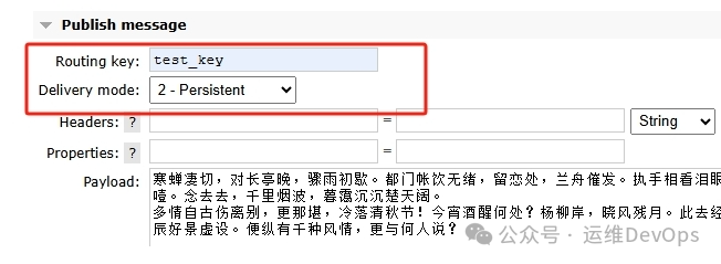 4、验证消息发送,点击创建的交换器new_chanage,下方有个Publish message,输入路由键,根据此路由键就能向绑定的队列发送消息,模式选择可持续,这样就能存在本地磁盘了,如图: