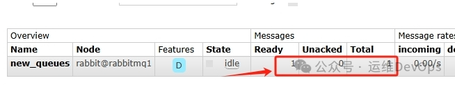 点击推送消息后,在队列页面可以看到Ready和Total已经显示有一条消息,如图: