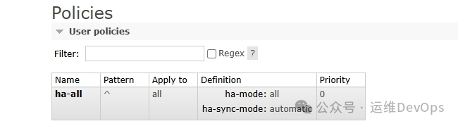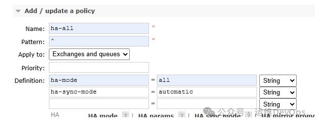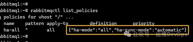 ha-mode:设置镜像队列为all,此模式下,队列会在集群中的所有节点上进行镜像