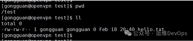 2、切换到普通用户gongguan,在test目录中创建文件hello.txt,如下: