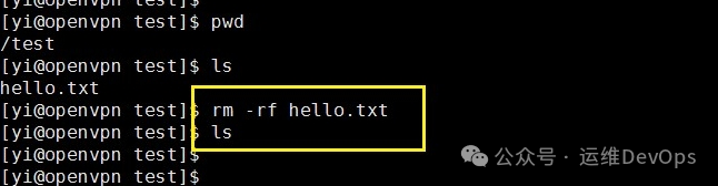 3、切换到yi用户,进入test目录中,看是否可以删除hello.txt,如图: