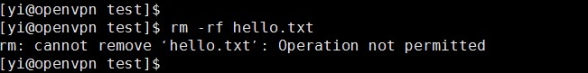5、重复前几步骤,然后在切换到用户yi来删除hello.txt,可以看到权限不足,如图:
