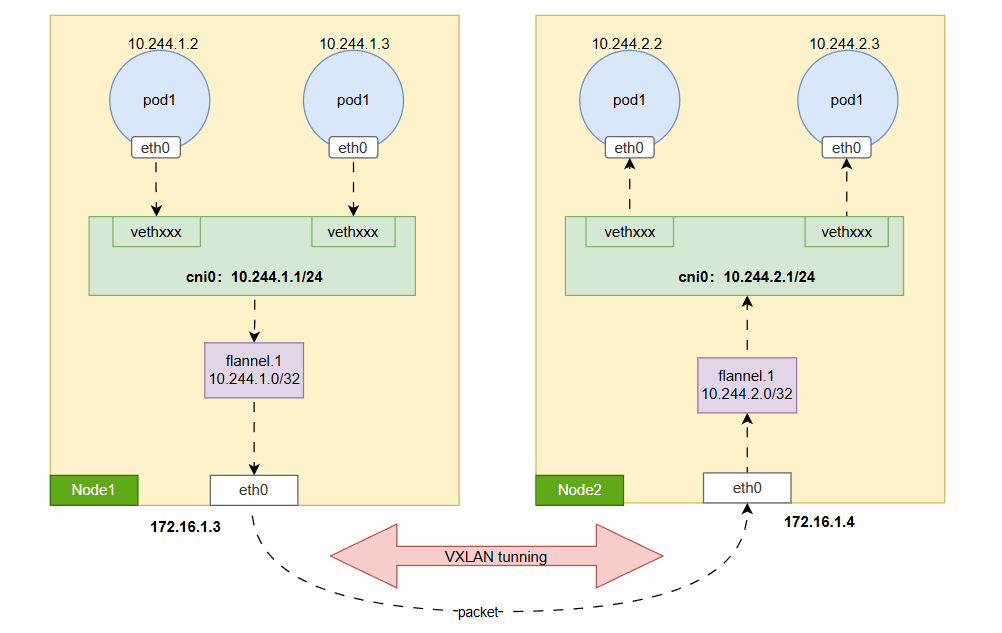 在L3层上通过VXLAN隧道封装数据包。 每个数据包被封装进一个新的UDP数据包,在两个节点之间通过UDP协议传输。