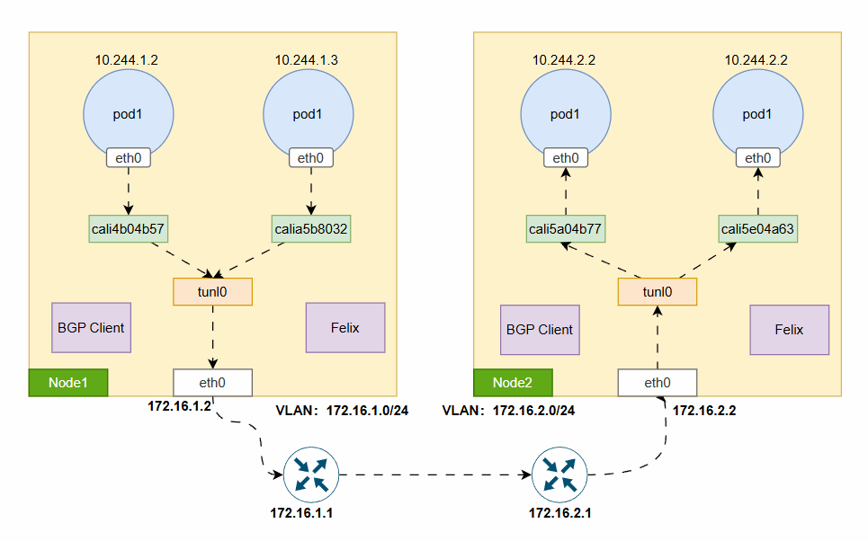使用BGP将每个节点的Pod CIDR通告给其他节点。 节点间直接路由通信,无需封装。