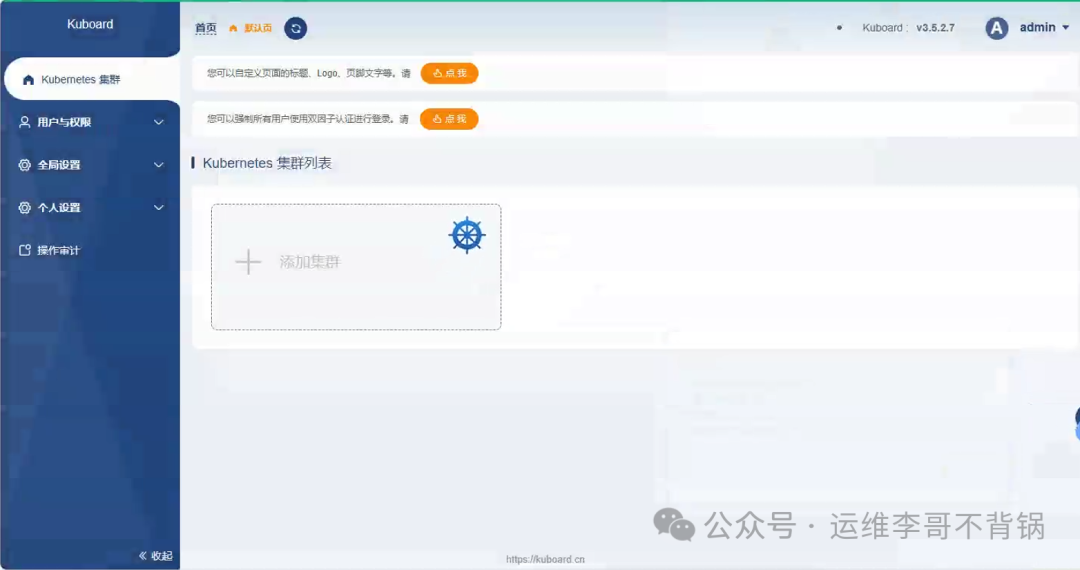 登录后界面,需要对kubernetes集群进行对接,可以对接多个集群