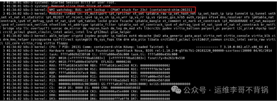 通过查看日志,K8S集群的第三个节点服务器存在"NMI watchdog BUG",导致它无法正常执行操作,陷入死循环。负载持续增高,导致K8S集群崩溃。