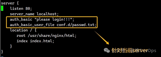 3、编辑nginx.conf,给server模块添加认证,如图: