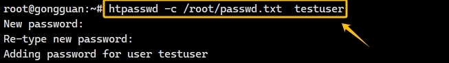 2、执行htpasswd命令生成用户名和密码文件,testuser是用户名,如图: