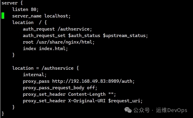 原理:首先请求进来后,先到达子请求/authservice,子请求的认证服务为http://192.168.49.83:8989/auth,如果子请求返回的状态码为2xx,表示请求成功,然后继续后面的root /usr/share/nginx/html,如果返回3xx或者4xx等,则表示请求不成功,认证不通过