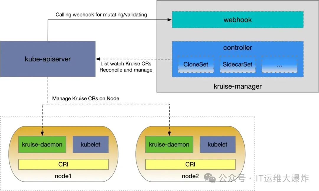 从 v0.8.0 开始,安装了 Kruise 之后,有两个在 kruise-system 命名空间下的组件:kruise-manager 与 kruise-daemon。前者是一个由 Deployment 部署的中心化组件,一个 kruise-manager 容器(进程)中包含了多个 controller 和 webhook;后者则由 DaemonSet 部署到集群中的节点上,通过与 CRI 交互来绕过 Kubelet 完成一些扩展能力(比如拉取镜像、重启容器等)。