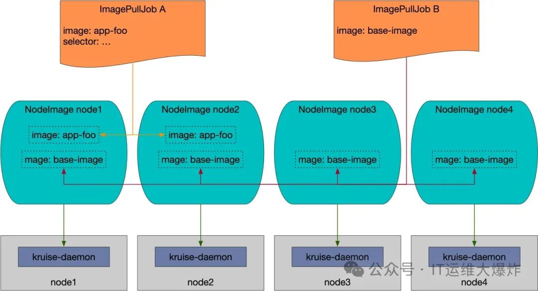 因此,Kruise 会为每个节点(Node)创建一个同名对应的自定义资源:NodeImage,而每个节点的 NodeImage 里写明了在这个节点上需要预热哪些镜像,因此这个节点上的 kruise-daemon 只要按照 NodeImage 来执行镜像的拉取任务即可: