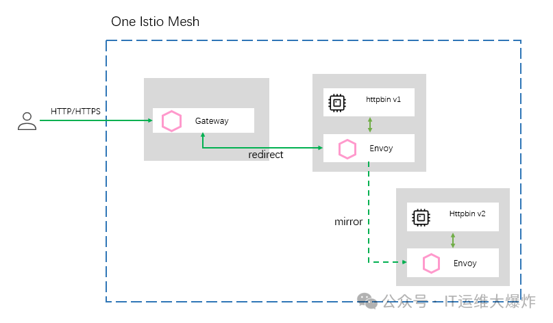 # 为httpbin-v1添加mirror设置,mirror点为httpbin-v2