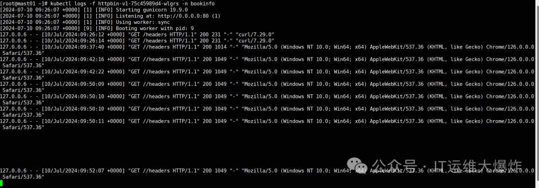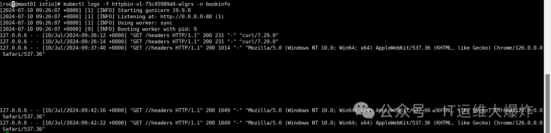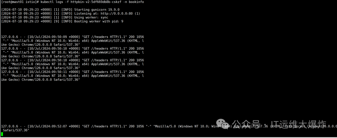 访问http://bookinfo.com/httpbin/headers,查看日志(发现v1和v2都有请求)