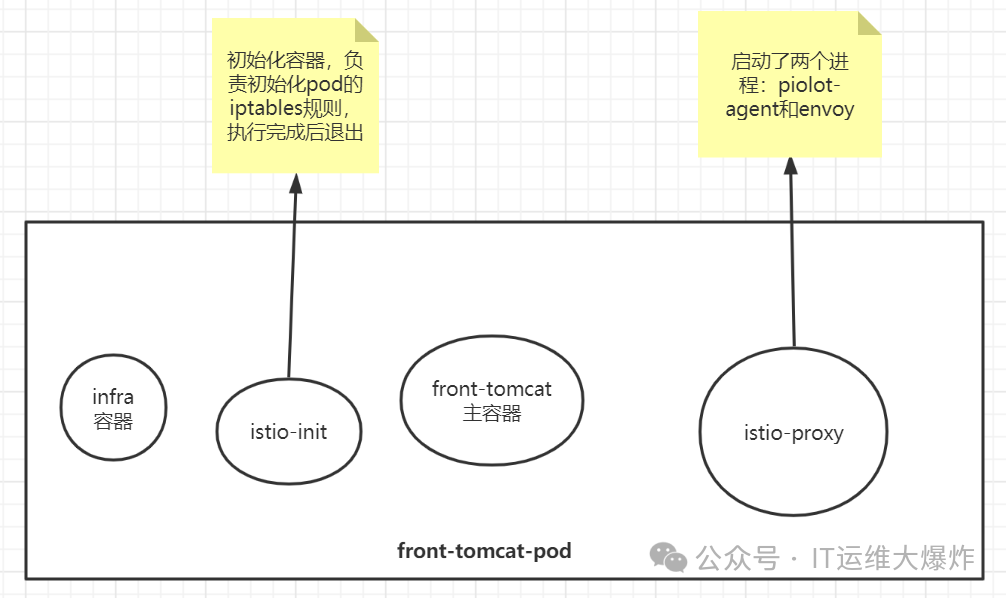 pod被istio注入后,被纳入到服务网格中,每个pod都会添加一个名为istio-proxy的容器(常说的sidecar容器),istio-proxy容器中有两个进程,一个是piolot-agent